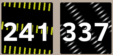 241's residue is 121 (112), and 337's residue is 169 (132). When a residue is a power of a prime greater than 7, the original DIVE responds by making the inner stripe's color be based on the residue of that prime rather than the power of the prime, but its opacity is doubled, hence why 241 gets a bright yellow (the color associated with 11's residue) even with only one factor of the prime. The Compendium, on the other hand, retains its "half opacity is half opacity, full opacity is full opacity" rule, so instead of doubling the opacity it doubles the inner stripe density, i.e. the color is still 11's residue's color but the inner stripes are bunched together at the density expected for 121 instead of 11.