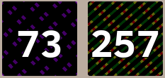 So far we've only seen stripes with one or two layers, but it's possible for them to have more than that - these two primes are examples of primes with three-layered stripes. 73's residue is 37, 37's residue is 19, and 19's residue is 10 (this would be a "third residue" or "supersuperresidue"), so 73's stripes are two black layers then a purple layer. 257's residue is 129, factor out the 3 (green), 43's residue is 22, factor out the 2 (red), 11's residue is 6 (yellow), so 257's stripe layers are green, red, yellow. In the original DIVE, when a stripe has three layers, it's actually the second layer, not the third, that's furthest on the inside - the third layer is the middle instead. In the Compendium version, the third layer is the innermost layer. The original DIVE probably went the way it did to make 73 more distinct from 37 - since both 1's would be black, 73 would just be "37 but the purple is thinner" (when it's on its own rather than on a non-black tile, that is) if the third layer was the innermost, whereas having the second layer be the innermost instead gives us black-purple-black as seen above. The Compendium gets around this issue, since the outermost 1 is grey but the middle 1 isn't. The reason I reverted this choice for the Compendium version will be discussed later.