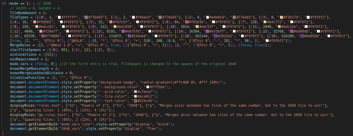 The 2048 Power Compendium uses a sort of miniature programming language defined within it for defining the rules of modes. This system is called CalcArrays, and now that some people have taken an interest in using them to make modes themselves, this blog post was made to document how they work.